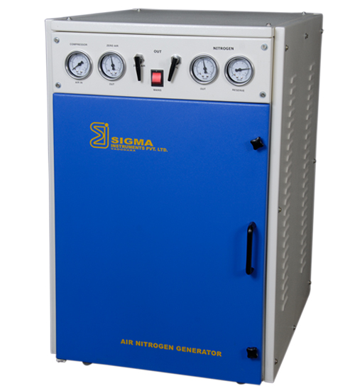 The generator produces Nitrogen and Zero Air of GC grade purity sufficient for use with up to 2 GCs. It employs pressure swing adsorption technology to produce continuous supply of high purity gas. An oil free air compressor delivers filtered compressed air to a bed of Carbon Molecular Sieve and activated alumina. The adsorbent bed alternates